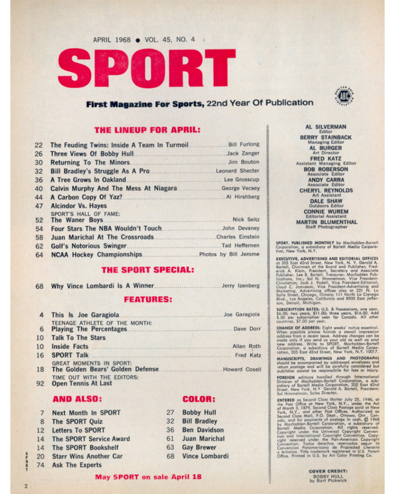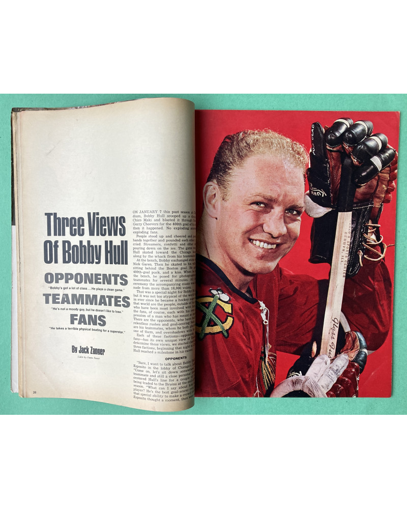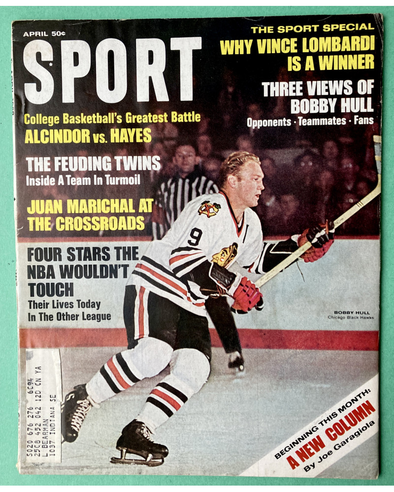 In addition to an internal story on Hull (and a color portrait), this magazine contains several other interesting stories including the feuding Minnesota Twins, Juan Marichal at the crossroads, New York Yankee pitcher Jim Bouton’s return to the minor leagues, a basketball battle between Elvin Hayes and UCLA’s Lew Alcindor (Kareem Abdul-Jabbar), and a look at the NCAA hockey championship with a photo of young Cornell goalie Ken Dryden and his coach Ned Harkness.